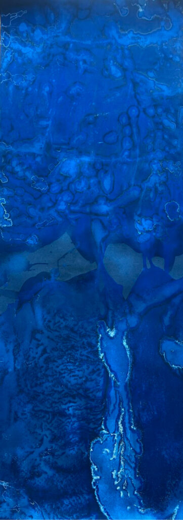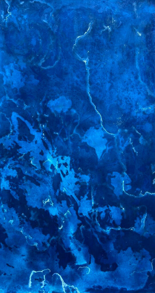 Ez az alkotás a mély idő rétegeit tárja fel. A túlcsordulás itt nemcsak formai jelenség, hanem tartalmi gesztus is: az emlékek nem férnek el az elmében, a szívben, és az alkotáson keresztül átszivárognak a jelenbe. A mediterrán homok, a tengeri só, a napégette homok részt vesz ebben a sűrű, majdnem szakrális festői szövésben. A mély kék színek soktónusú világa úgy működik, mint egy emlékezésen átszűrt látvány.