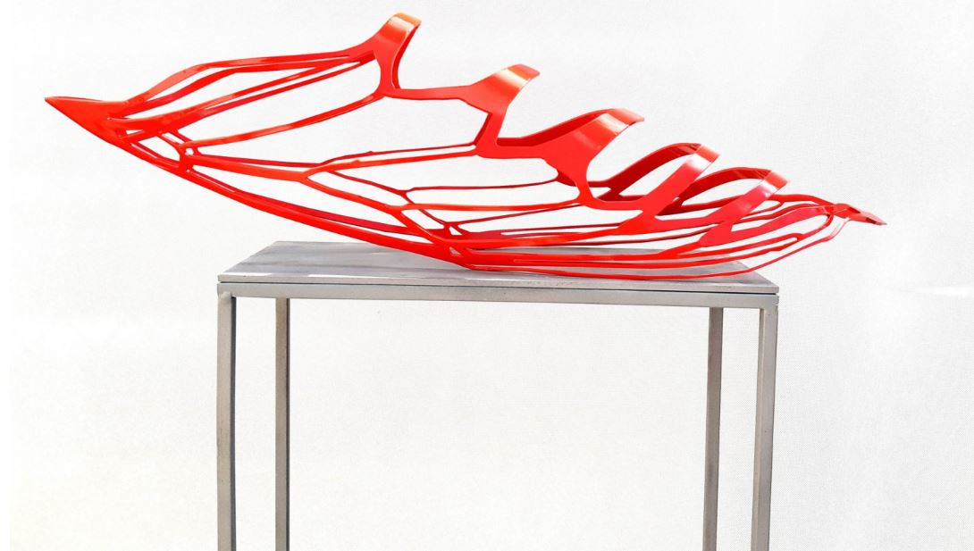 A Valami piros című munkám szintén lézervágott, hengerített és festett acél, ami egy torzított rovarszárnyból épül fel. A piros szín egy fontos elem a munkáimnál, nagyon sokrétű jelentéssel bíró szín, és rendkívül karakteres. Egy olyan formát szerettem volna létrehozni ezekből a törékeny jelenségekből amely erőt és határozottságot sugároz.