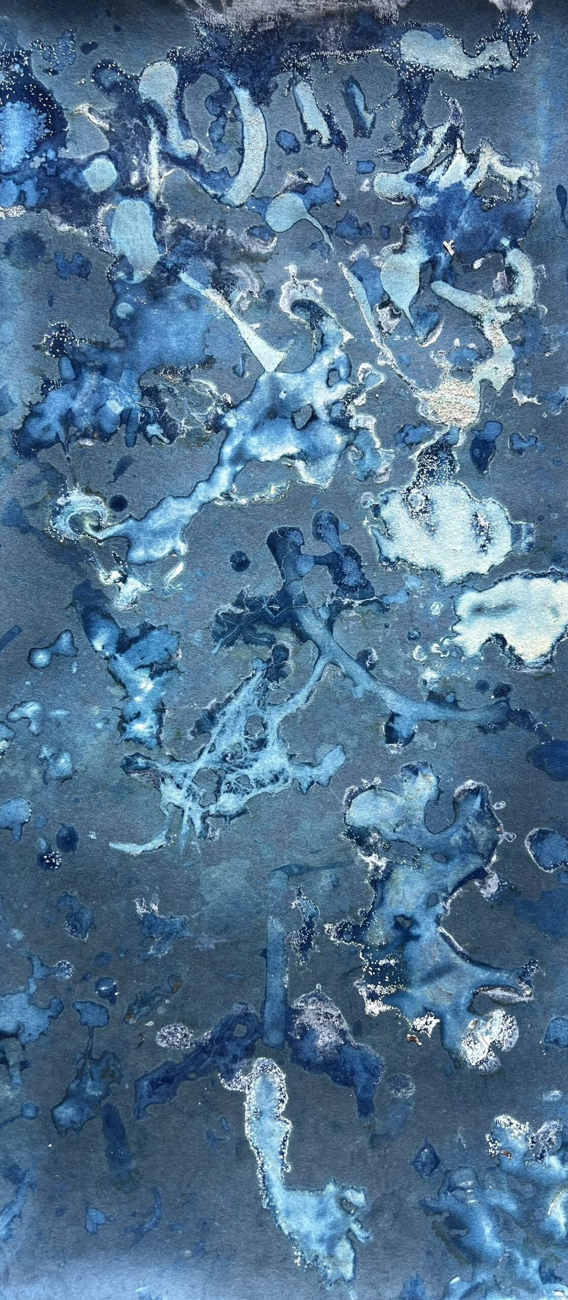 A kék végtelenség árnyalatai a víz mélységét idézik, egyszerre sugallva a nyugalmat és a mély belső utazás lehetőségét. A felületen futó, végtelenbe nyúló utak a belső utazást jelölik, amely lassan egyensúlyhoz, megérkezéshez és a jelen pillanat befogadásához vezet. A kompozíció minden részlete a természet szabad, ritmikus játékát rögzíti. A formák tánca és az anyagok összjátékának harmonikus egységét teremti, ahol a kontroll és az elengedés egymást kiegészítve jelenik meg.