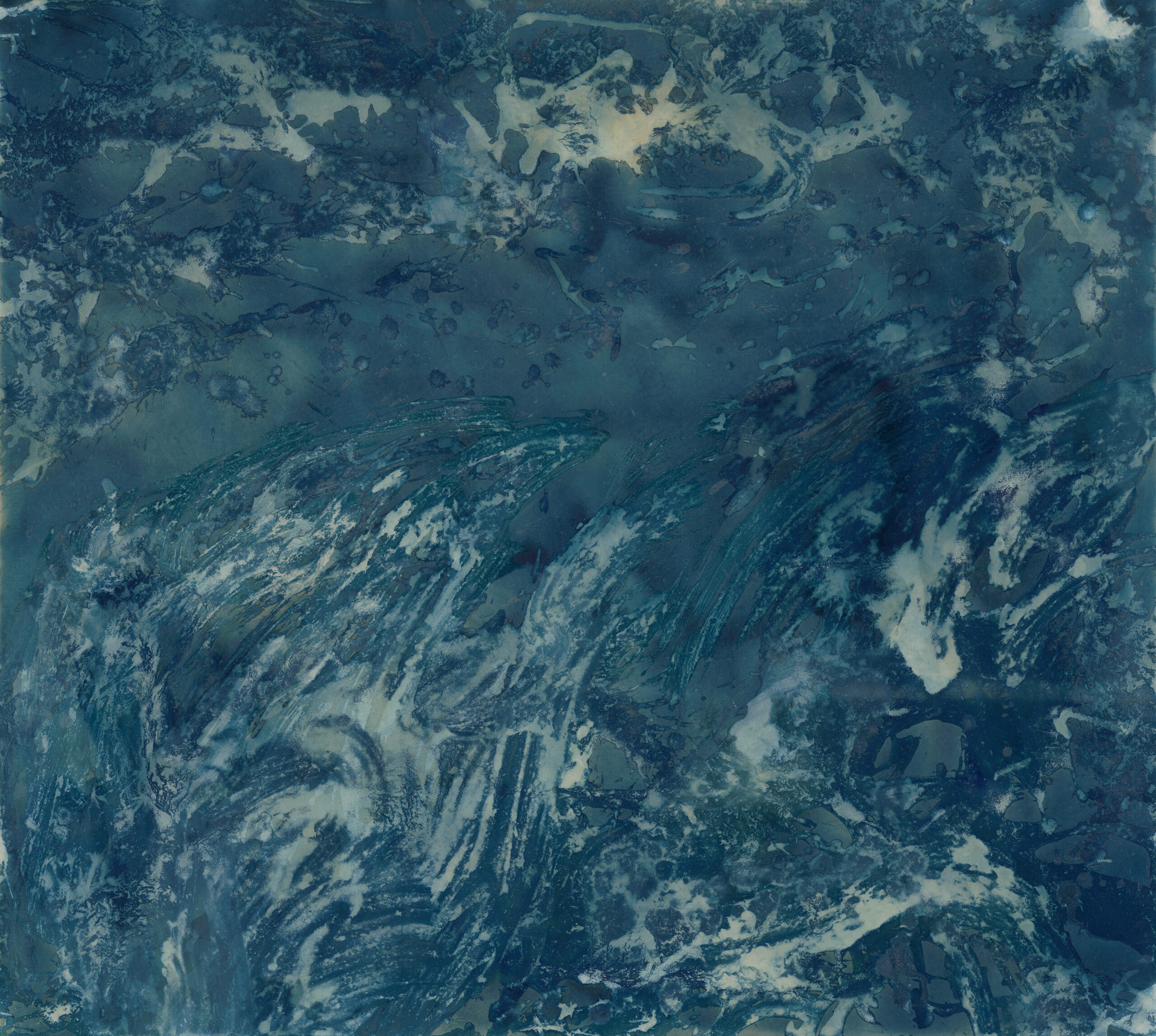 Az alkotásban a változó időjárás finom hangulatai kelnek életre. Ragyogó napsütés, sejtelmes felhők, lágy szél és csendes eső váltakoznak, létrehozva egy folyamatosan mozgó, élő vizuális élményt. A kékek és halványkék-fehér árnyalatok, valamint a természetes törmelékek változatos textúrái egyszerre nyugtató és felemelő pillanatokba engednek betekintést. A néző tekintete követi a hullámok lendületét, miközben az alkotás a természet erejét sugározza. Nincs középpontja, hiszen a vizuális utazásban maga a dinamika a lényeg. Minden részletből tiszta, jóindulatú energia áramlik.